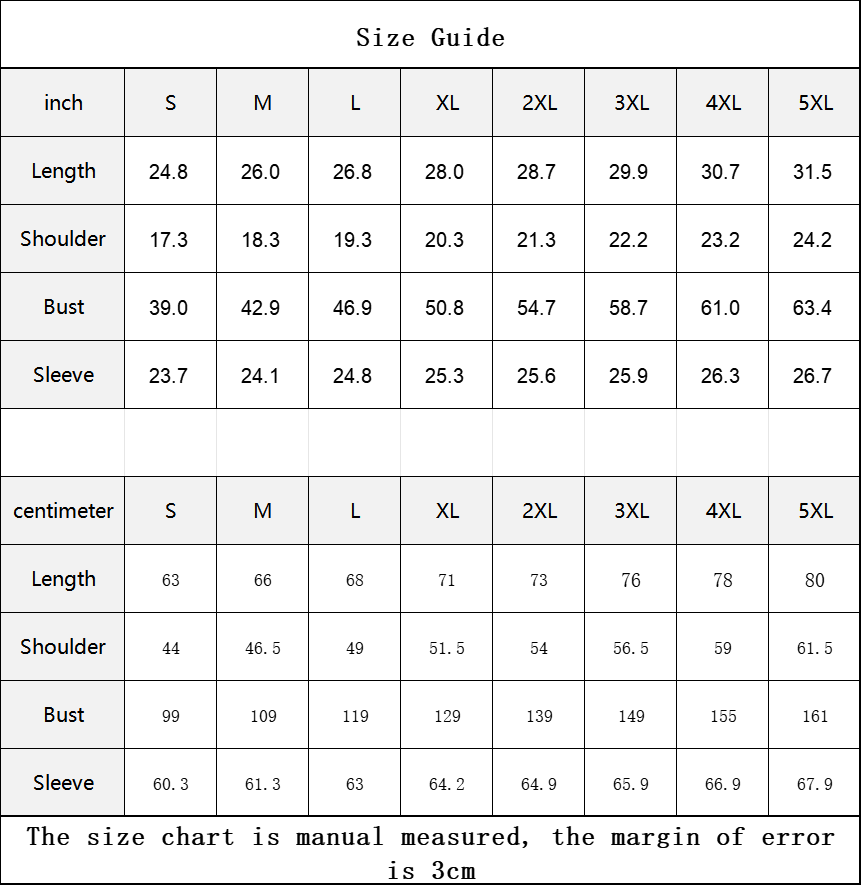 inch | S | M | L | XL | 2XL | 3XL | 4XL | 5XL |