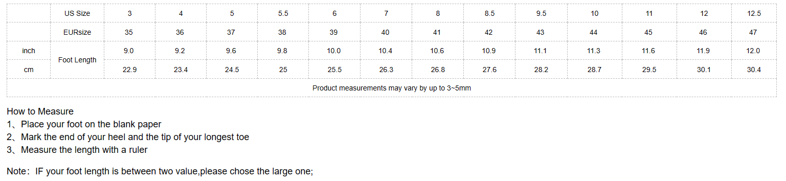 Note:IF your foot length is between two value,please chose the large one;