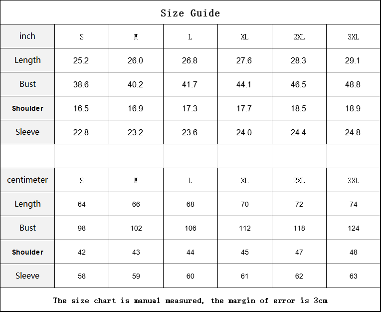 inch | S | M | L | XL | 2XL | 3XL |
